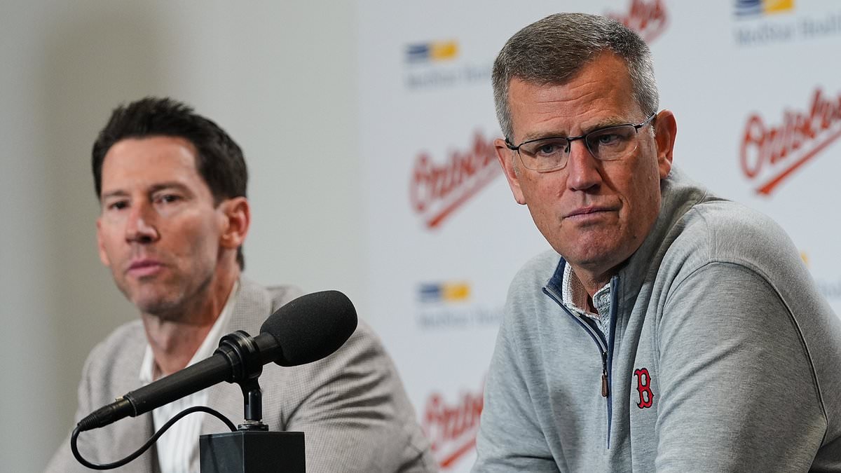Craig Breslow (left) and Sam Kennedy (right) discuss manager Alex Cora's dismissal with reporters on Sunday in Baltimore, where they were forced to use an Orioles backdrop