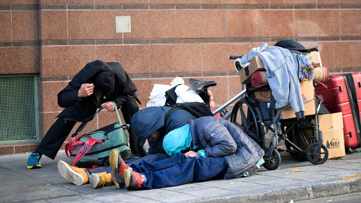 AT&T and nearly 100 other stores closed locations in San Francisco’s Union Square neighborhood in 2023 due to rampant homelessness and crime. Some homeless people in the city are pictured