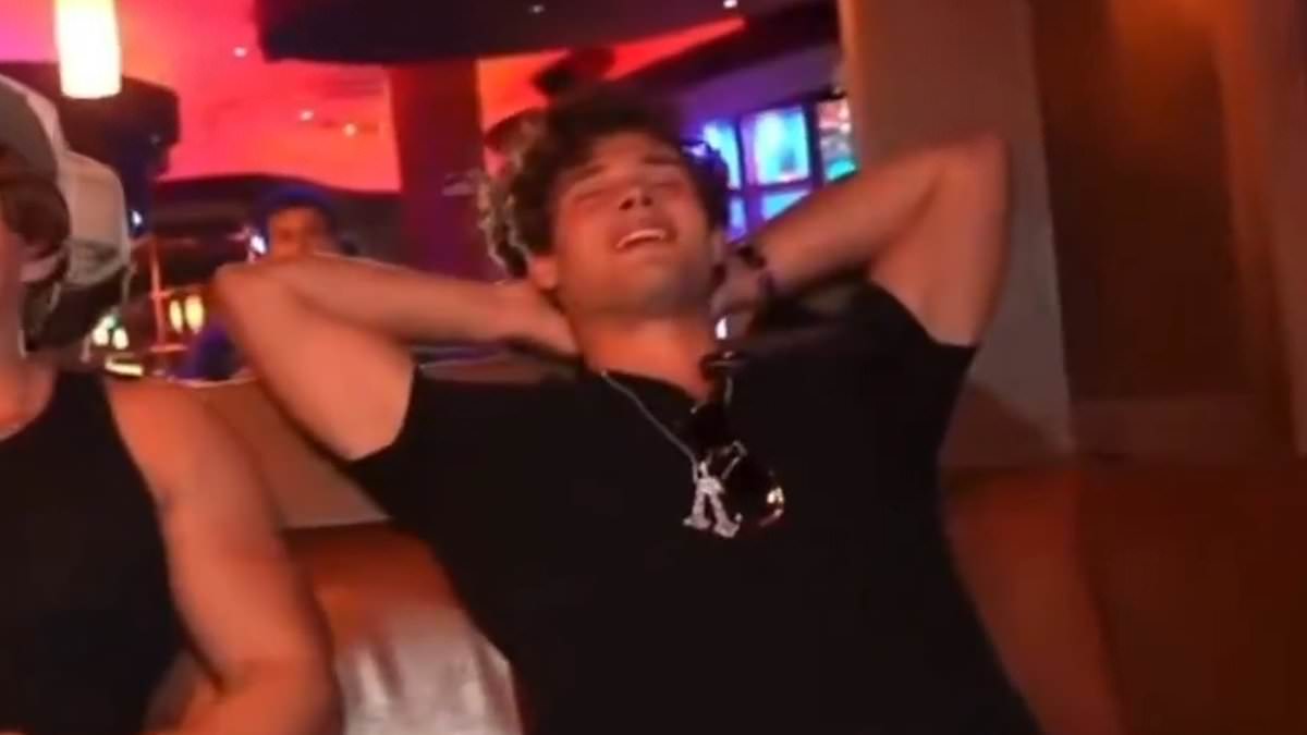 Clavicular (right), real name Braden Eric Peters, is seen on Tuesday evening’s livestream at a bar in Miami. Moments after this, he slumped over on the table