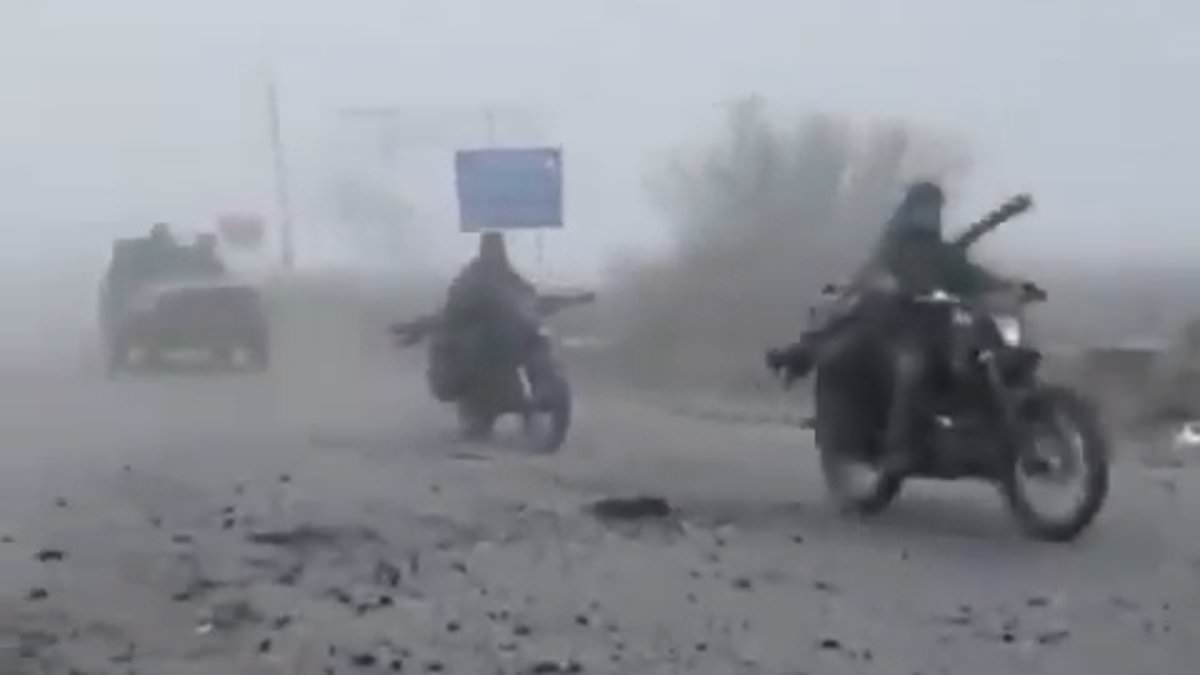 In a video shared by the Kyiv Post, troops are seen clinging to worn-out cars and motorbikes as they navigate a road littered with debris. A damaged drone is visible on the roadside as the procession disappears into the mist.