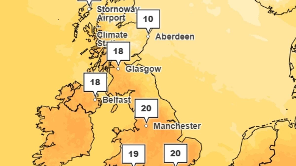 Forecasters are predicting strong sunshine and highs of 20C across the country on Thursday, with the warm weather set to stretch into the weekend