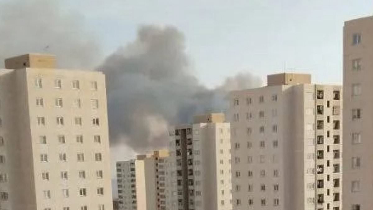 At least four people were killed when the explosion struck a residential building. Picture shows thick plumes of smoke billowing out of an apartment block following an explosion in Iran
