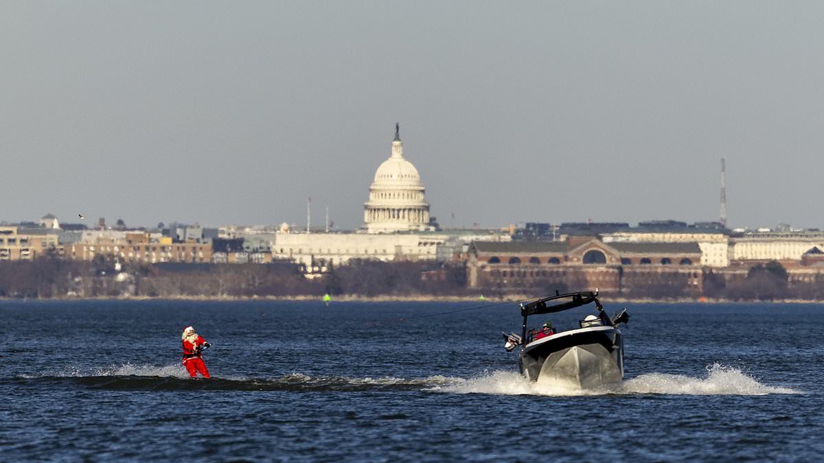 Santa Claus participates in the Christmas Eve Water Skiing Santa Show on the Potomac River, with the US Capitol in the background, in Alexandria, Virginia, USA, 24 December 2025