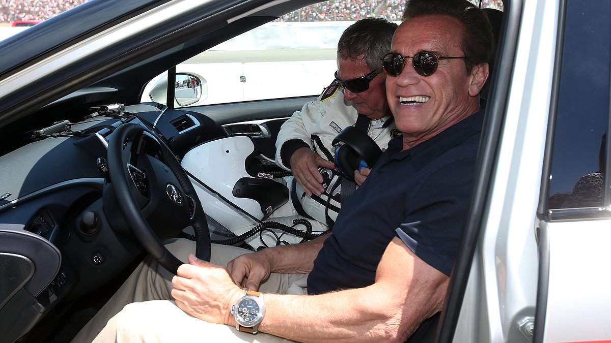 Actor and former governor of California Arnold Schwarzenegger poses for a photo before driving the 2016 Toyota Mirai pace car
