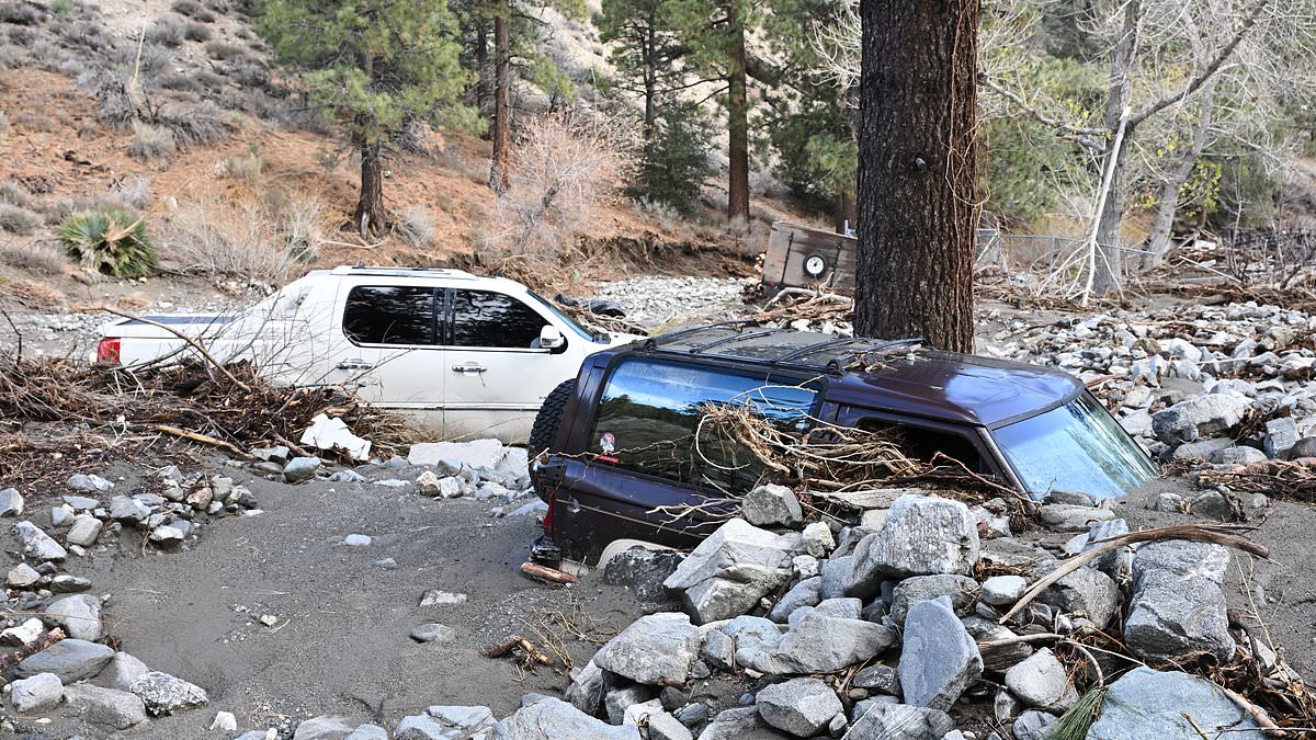 Cars are buried in mud after a series of storms. The aftermath is pictured on Christmas Day in Wrightwood, California