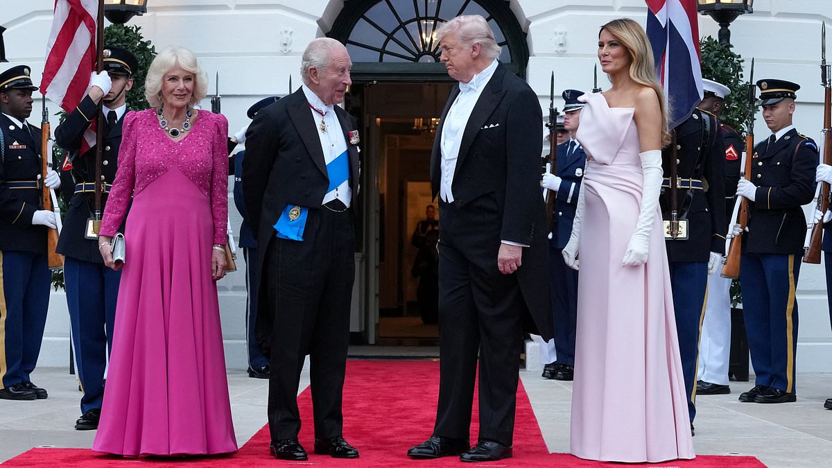 President Donald Trump and First Lady Melania Trump (right) greeted King Charles and Queen Camilla (left) on the South Lawn Tuesday night for the first state dinner of the President's second term