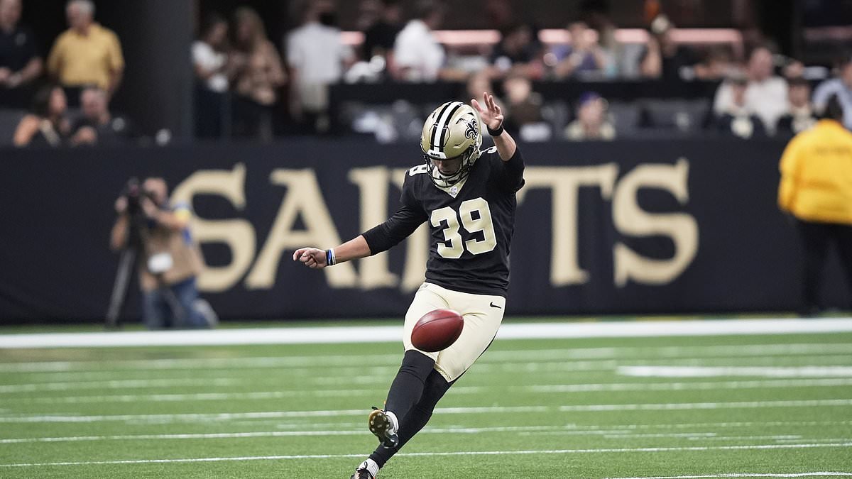 New Orleans Saints place kicker Charlie Smyth kicks off from his own 35. Meanwhile, off camera, his teammates are lined up at their opponents’ 40-yard line