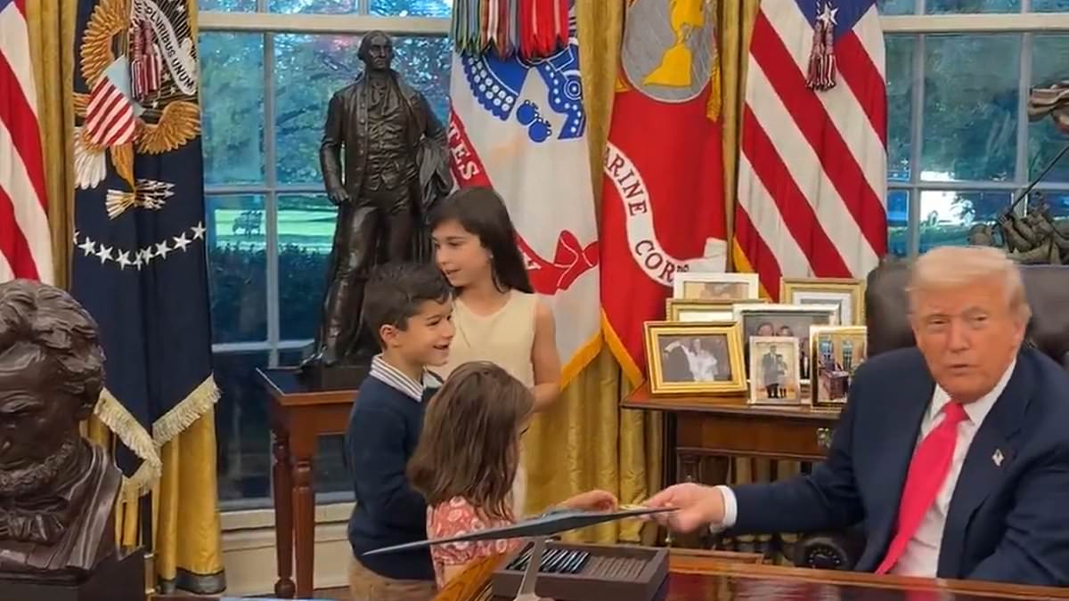 In the video, Trump offers gifts to the grandchildren of journalist Salena Zito at the Resolute Desk.