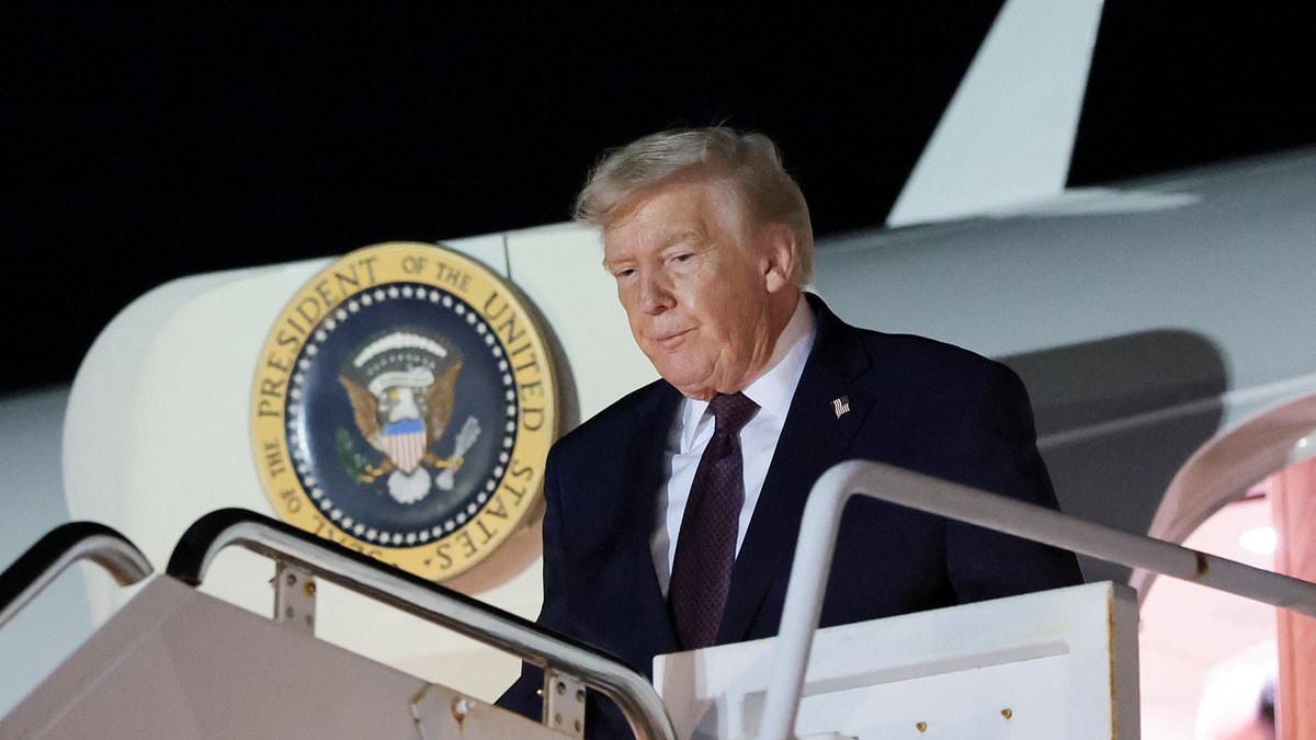 President Donald Trump remained silent about the release of thousands of photos related to convicted pedophile Jeffery Epstein while speaking at a Friday night rally. Pictured: Trump getting off a plane at West Palm Beach International Airport to head to his Mar-a-Lago resort
