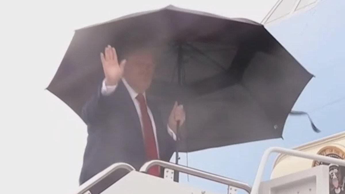 Before boarding Air Force One at Joint Base Andrews in Maryland, Trump spoke to reporters, holding an umbrella that fluttered in the strong wind. He then waved goodbye and stepped onto the plane.