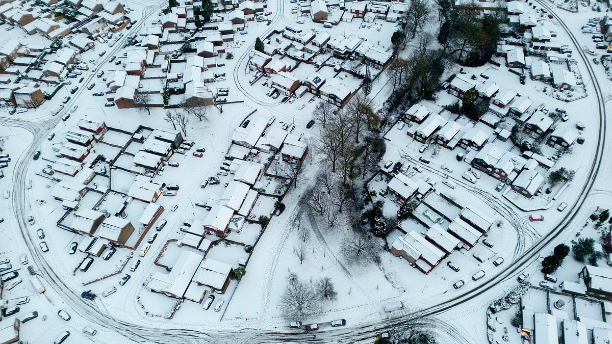 Snow settles around the A465 in the Dowlais area of Merthyr Tydfil in South Wales on Friday