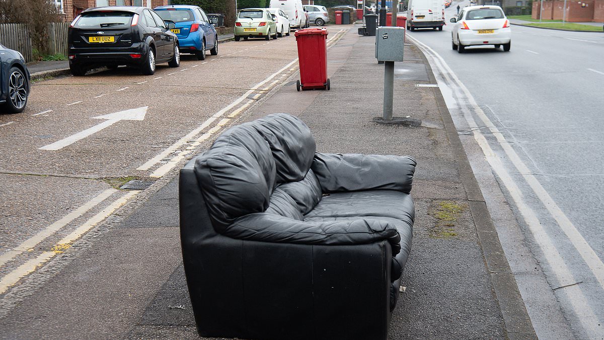 Fire safety rules that forced British sofas to be packed with potentially harmful chemicals are finally being overhauled after a years-long campaign by a mother who warned they posed a risk to families. Pictured: A sofa dumped on a pavement in Chalvey
