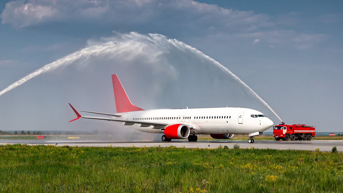 This ritual, known as a plane water salute, involves fire engines spraying water in a grand arc over the aircraft, forming a watery archway for it to pass through.