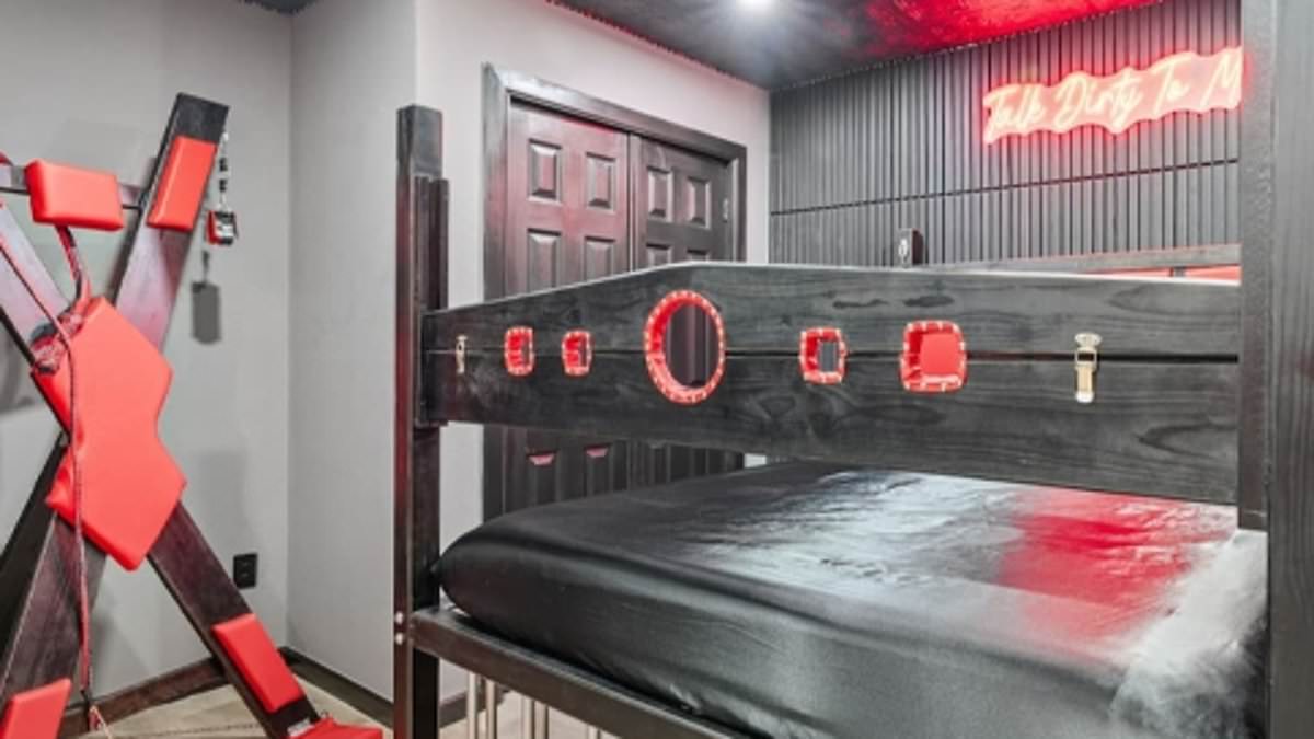 Billed as a ‘romantic and whimsical retreat,’ this Florida rental, priced at $600 per night, comes equipped with a variety of BDSM accessories including floggers, paddles, restraints, and spanking benches, all set against a backdrop of purple and black decor.