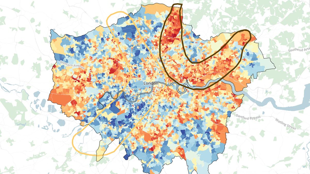 With the same data, we can now reveal a ‘rotten banana’ – a segment of northeast London typically ranking at the lower end of the same tables concerning crime, deprivation, health, and house prices.