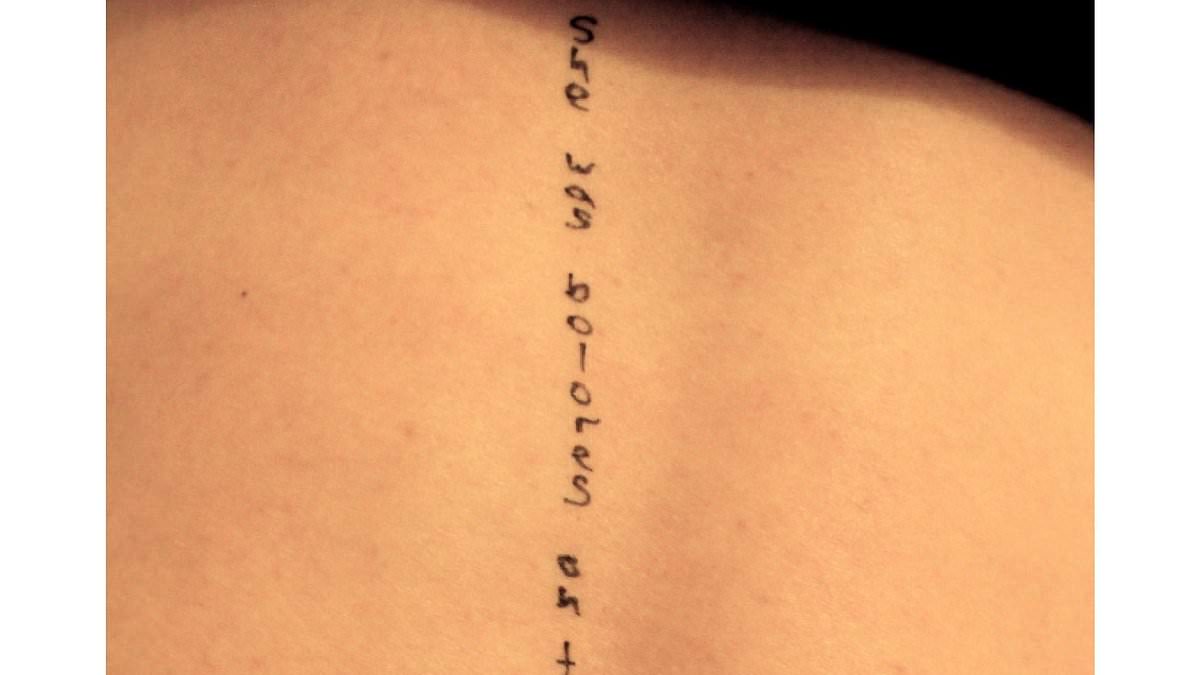Another shows: ‘She was Dolly at school’ written on a woman’s neck, while a separate image captures the line ‘She was Dolores on the dotted line’ running down a woman’s spine.