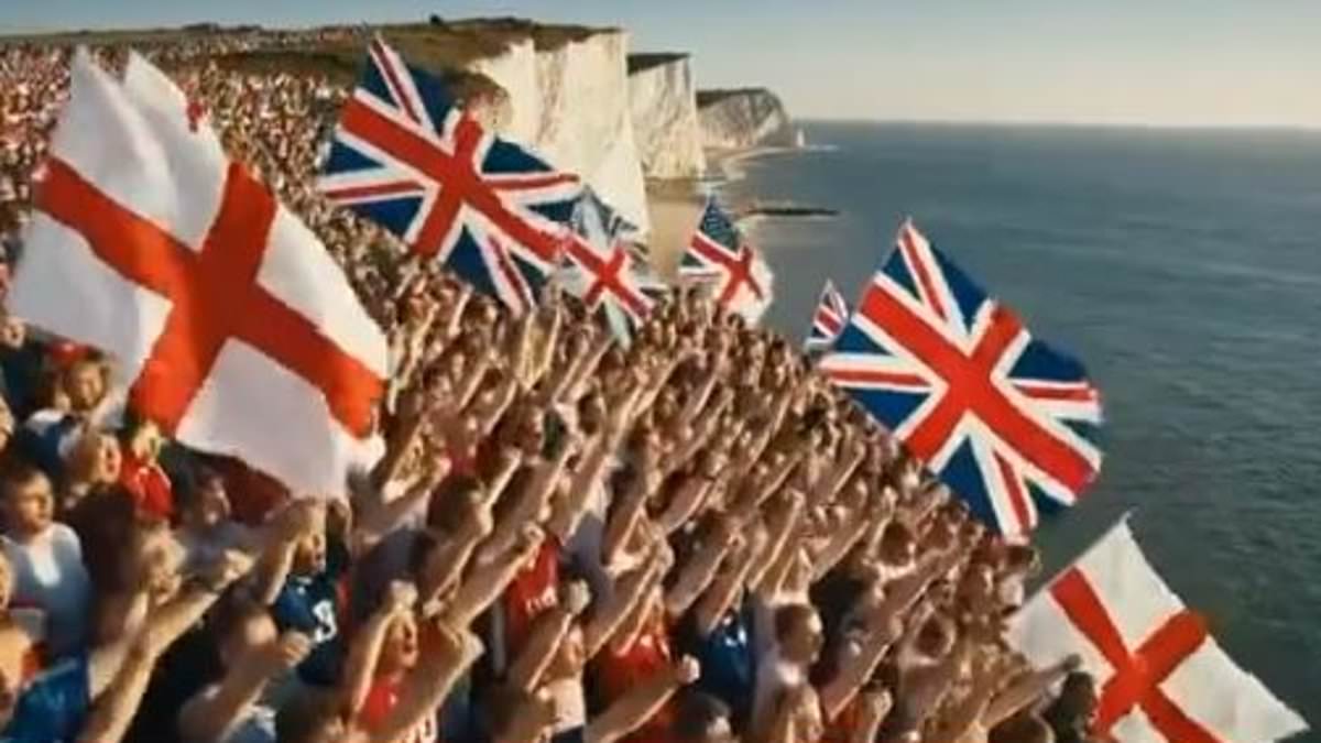 An AI video going viral online showing huge crowd of men stand on top of the White Cliffs of Dover, waving Union Jacks, shouting in unison: ‘Protect our country! Protect our people! We will not be moved! Secure our border!’