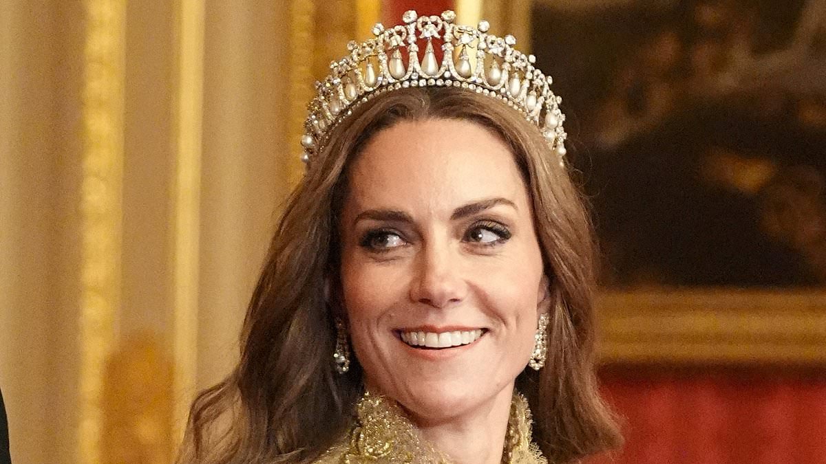 Nonetheless, the Princess of Wales, 43, garnered attention, donning a bespoke gold lace gown designed by Phillipa Lepley. She completed her ensemble with the pearl-laden Lover’s Knot Tiara and earrings once belonging to Diana, Princess of Wales.