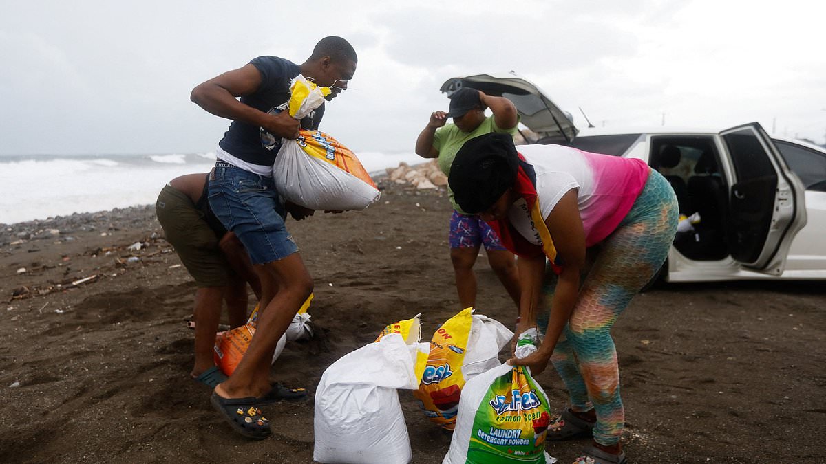 People fill bags with sand in preparation for the arrival of Hurricane Melissa, in Port Royal, Jamaica