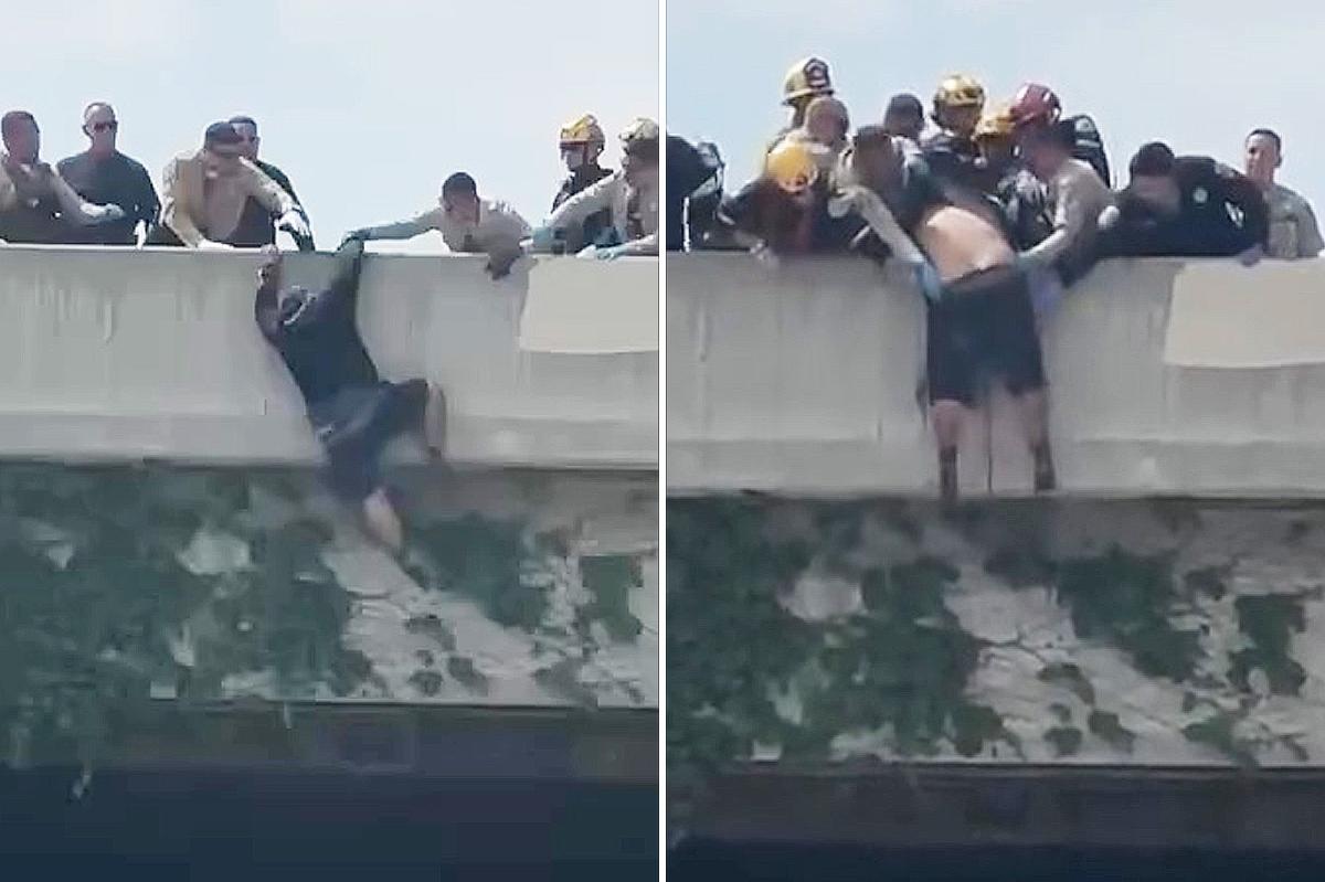 A dramatic rescue unfolded in Los Angeles when a man teetering on the brink of tragedy was saved by a swift and coordinated effort from a group of rescuers. The heart-pounding scene, captured on video, shows the moment when a group of officers managed to prevent a potential suicide from a freeway overpass.