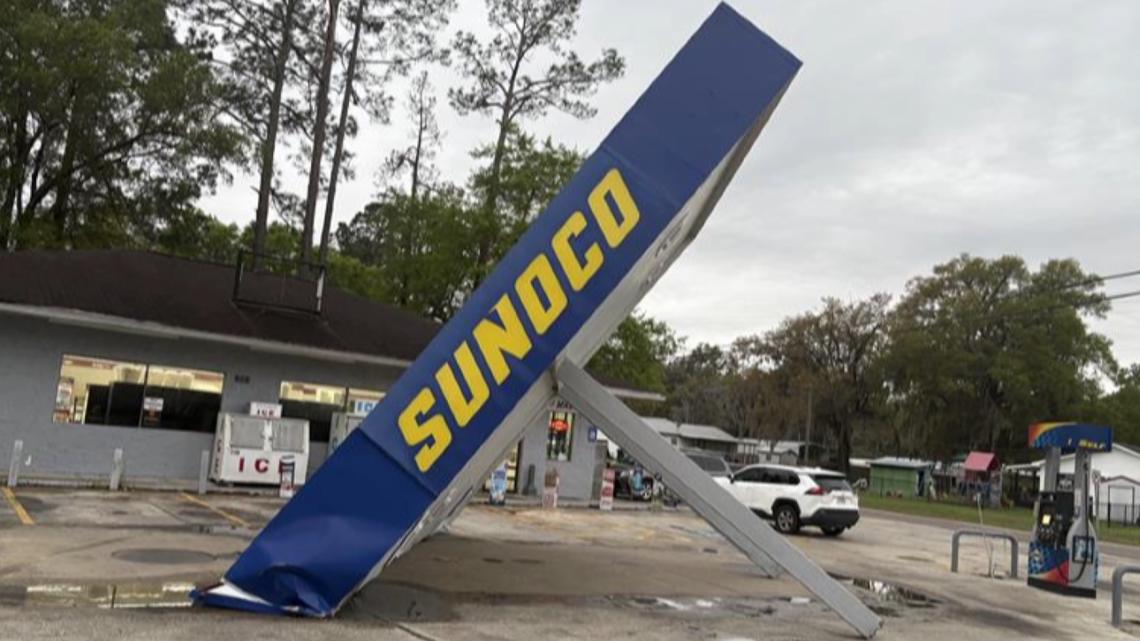 Powerful storms lashed Northeast Florida, causing significant damage, including the collapse of a gas station awning in Hilliard, with several counties reporting widespread impacts.