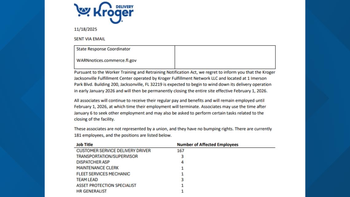 Kroger has announced that 181 employees at the Jacksonville Fulfillment Center will face job losses when it shuts down on February 1, 2026, according to the recent WARN notices.