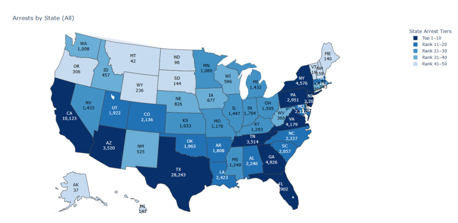 Southwest border states like California and Arizona have reported significant numbers of arrests, with 10,123 and 3,520 respectively. Other states ranking in the top 10 for immigrant arrests include: