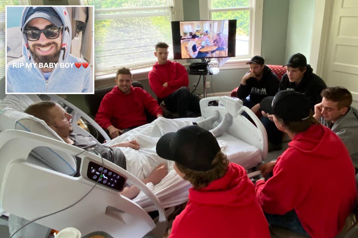 Markus Schouten lying in a hospital bed surrounded by friends and family.