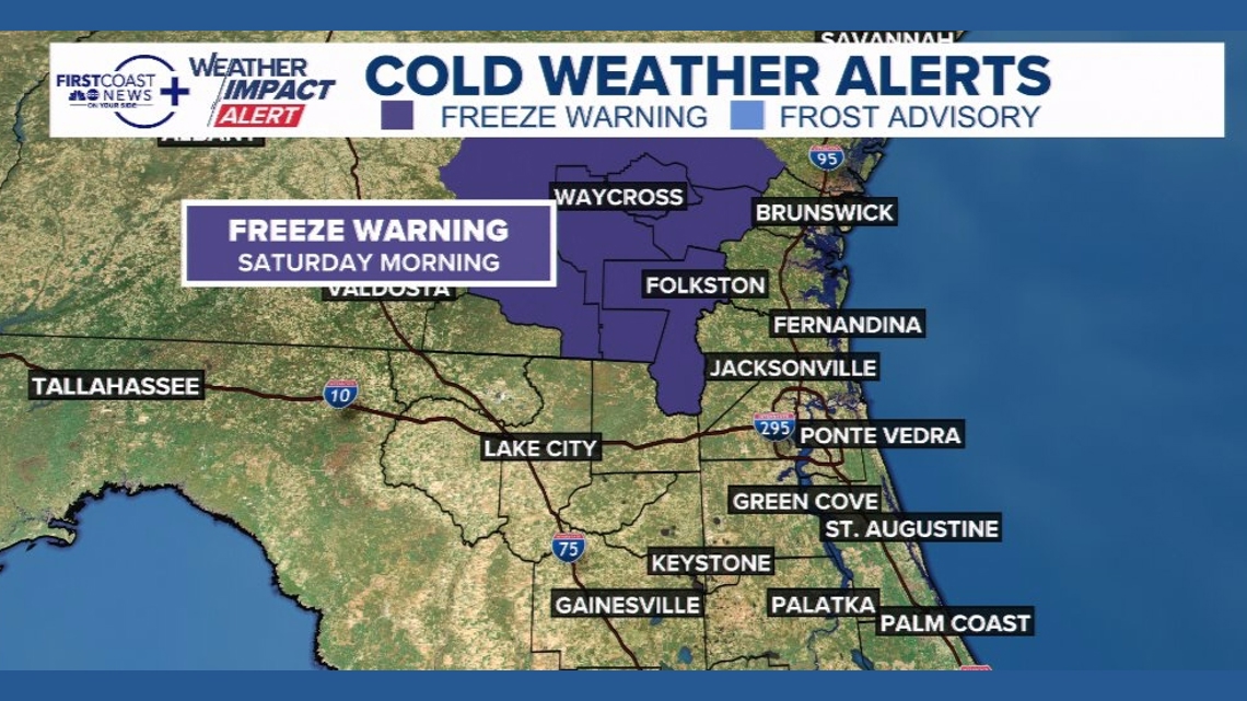 JACKSONVILLE, Fla. — Anticipating freezing temperatures and biting wind chills, the First Coast News Weather Team has announced a Weather Impact Alert for early Saturday morning, particularly affecting Southeast Georgia.