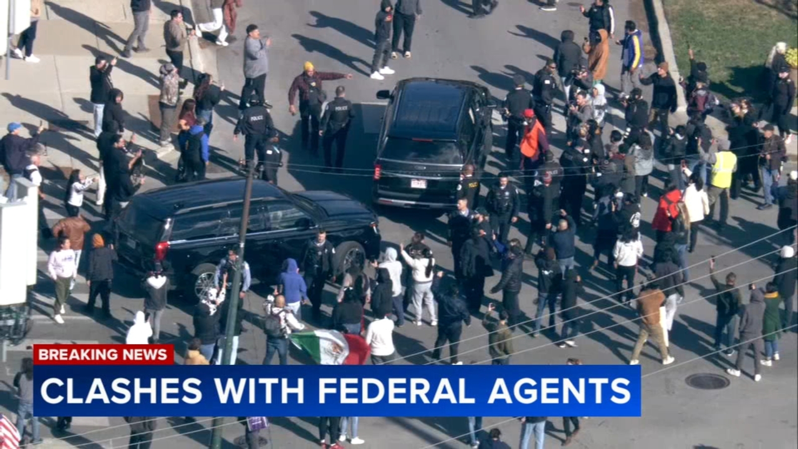 The commotion began around 10:15 a.m. when police received numerous 911 calls, including one from federal agents, directing them to the vicinity of 26th Street and Whipple Street. Chopper 7 captured aerial footage of the scene, where a large crowd gathered around federal agents who were stationed inside an SUV.