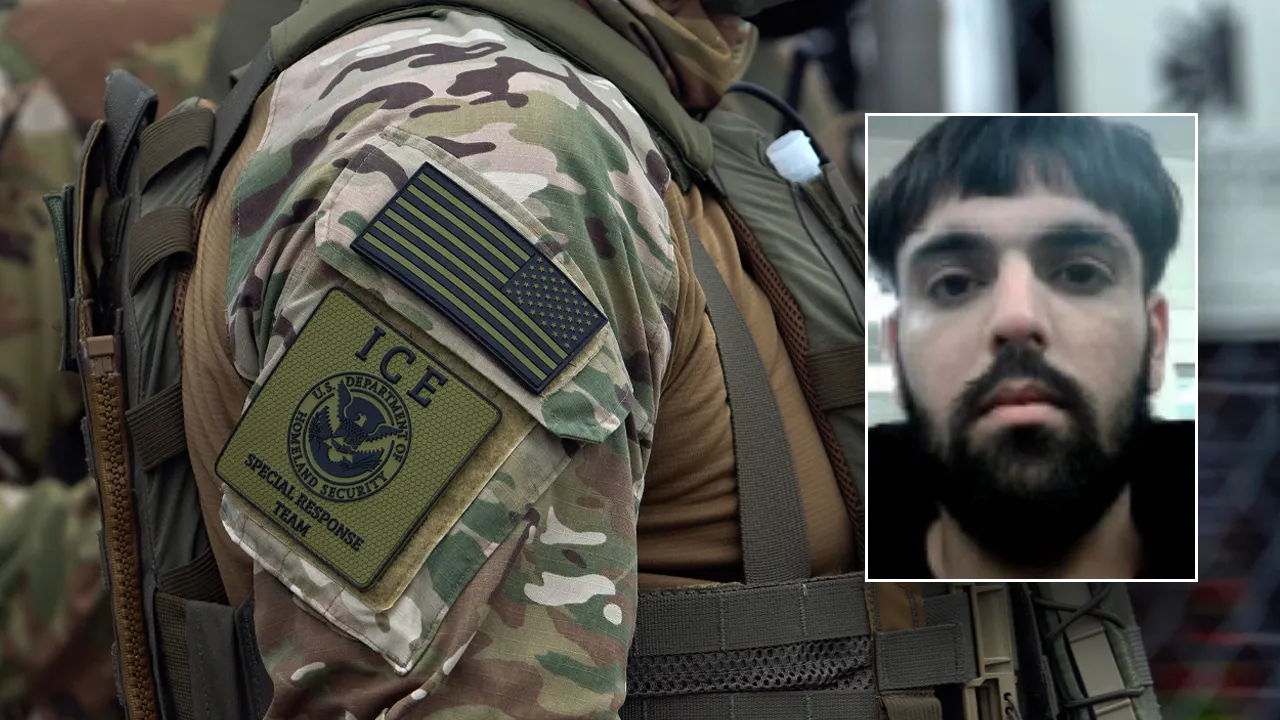Split image of an ICE agent patch and Kamalpreet Singh’s mugshot. (DOMINIC GWINN/Middle East Images/AFP via Getty Images and DHS)