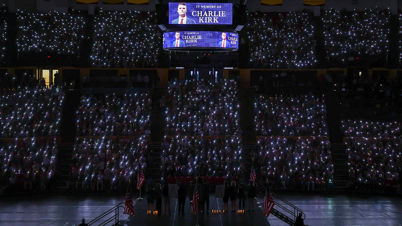 In remembrance of Charlie Kirk, attendees held up their illuminated phones during a vigil at Desert Financial Arena on the Arizona State University campus in Tempe on September 15, 2025. (CHARLY TRIBALLEAU/AFP via Getty Images)