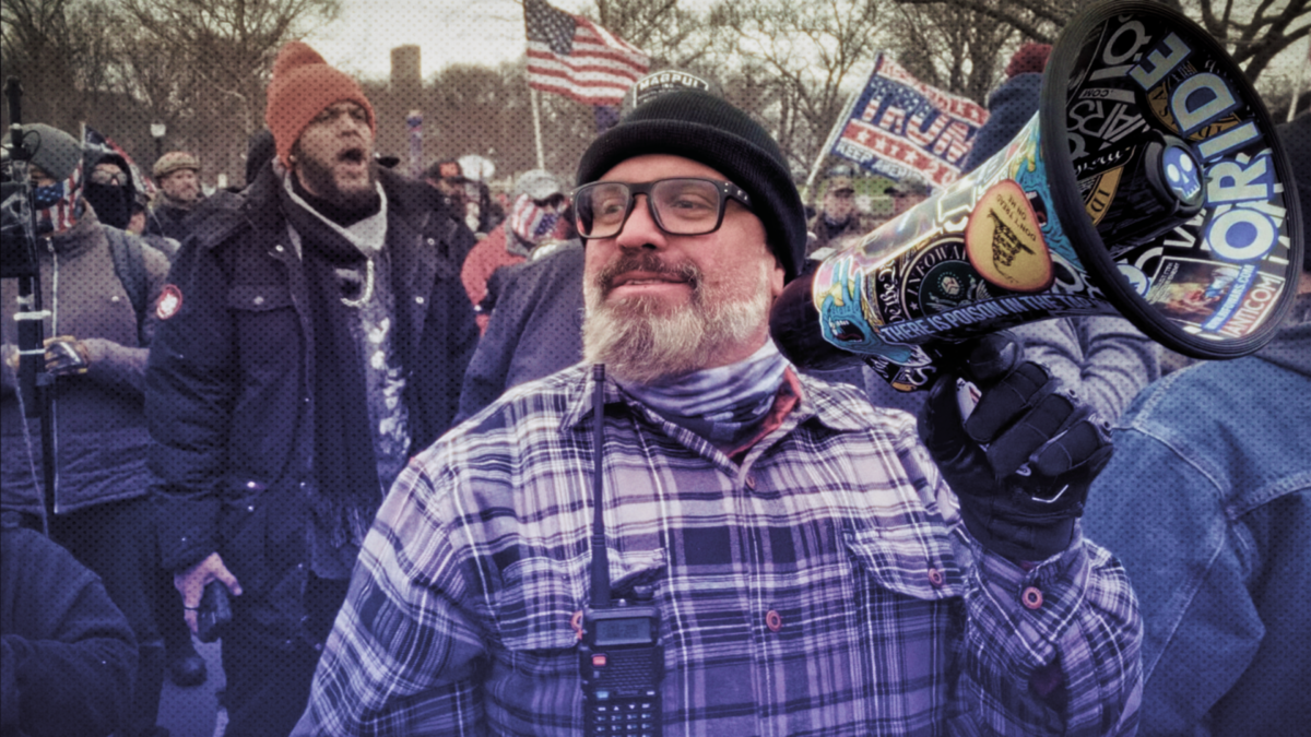 WASHINGTON, DC – JANUARY 06: Joseph Biggs, a Proud Boys leader, uses a megaphone during a march in front of the Capitol Building on January 6, 2021 in Washington.