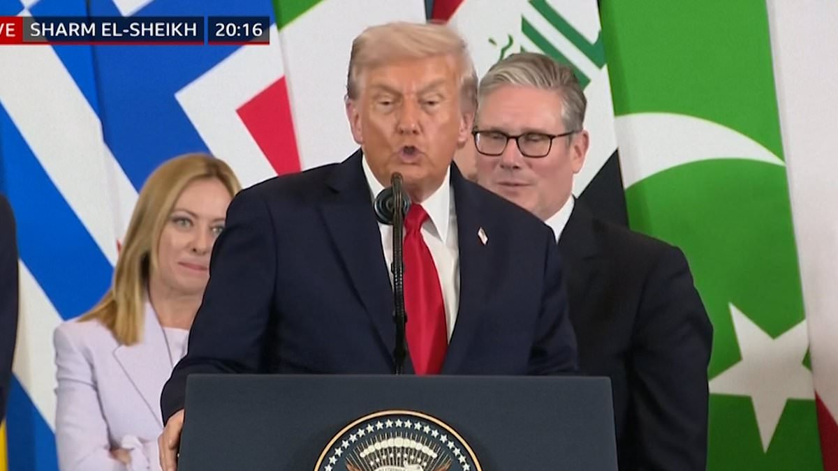 The UK Prime Minister stood behind the US President as he addressed the global media in Sharm El-Sheikh, Egypt, taking a moment to commend leaders for their roles in peace agreements.