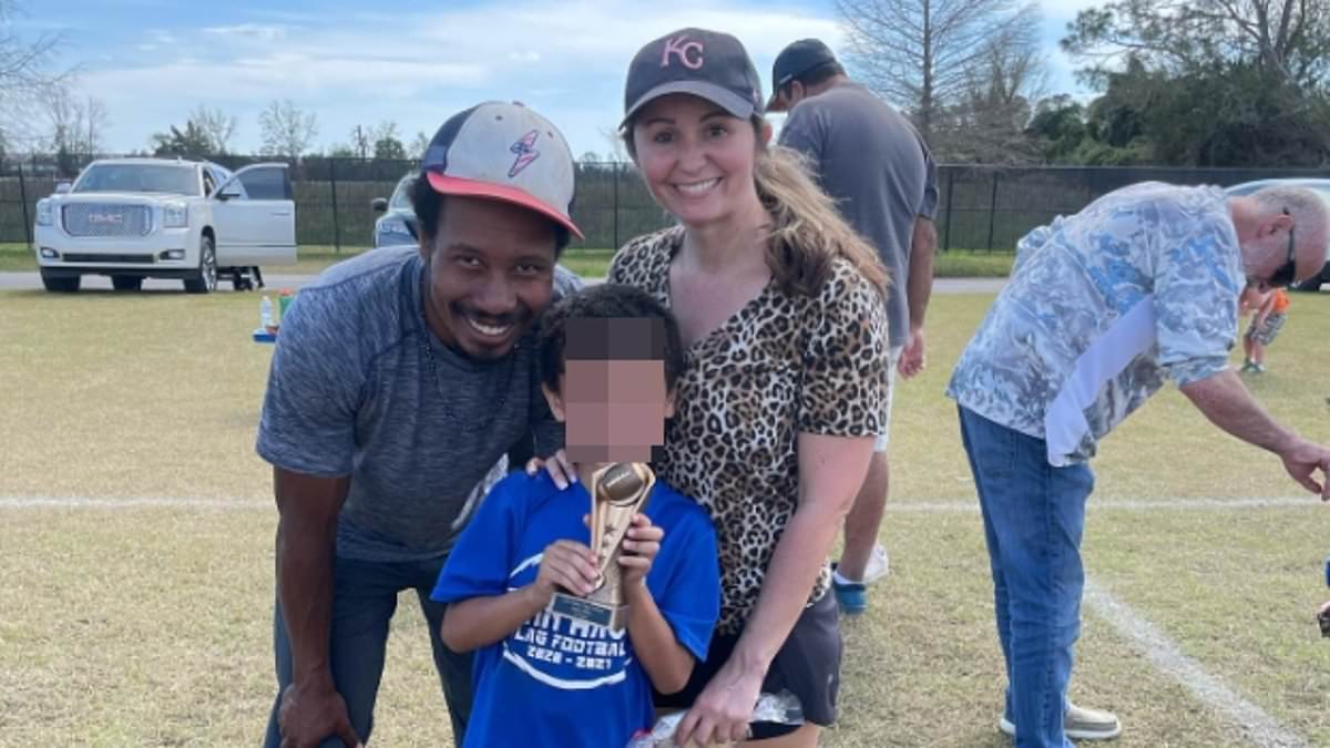 Gore is pictured with his wife Britney and their son Zane after watching him play flag football