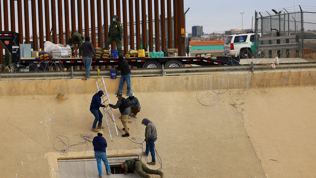 U.S. Border Patrol agents and workers use concrete to seal an illegal tunnel crossing the U.S.-Mexico border, as seen from Ciudad Juarez, Mexico, January 16, 2025