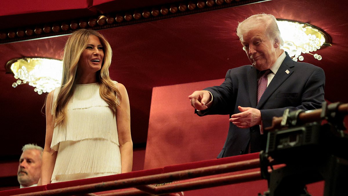 President Donald Trump (right) gesticulates at the audience alongside First Lady Melania Trump as the first couple attended the opening night of the musical Chicago at the newly renamed Trump Kennedy Center Tuesday night