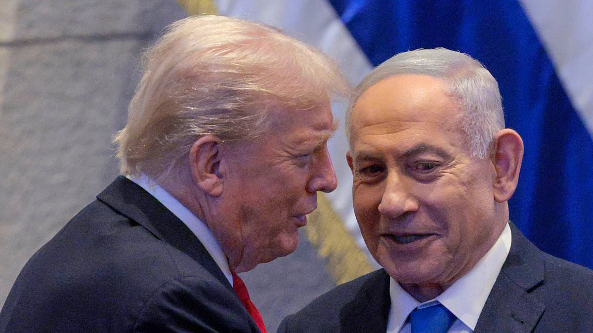 U.S. President Donald Trump talks with Israel’s Prime Minister Benjamin Netanyahu in the Knesset, Israel’s parliament, on October 13, 2025 in Jerusalem