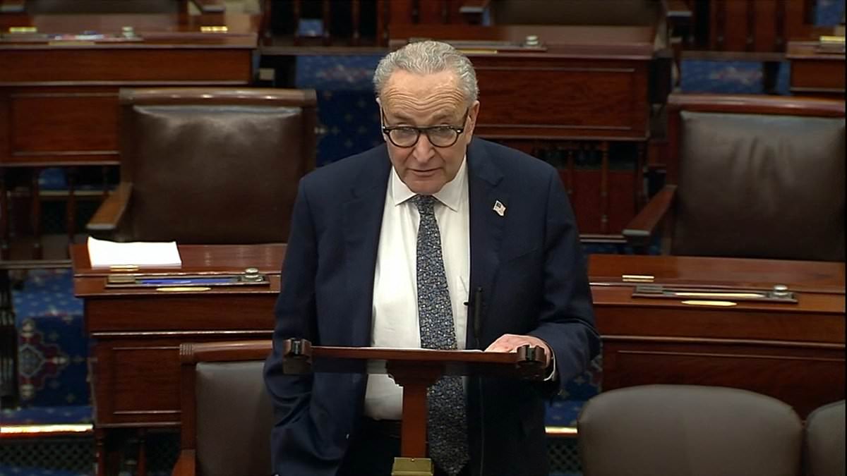 Sen. Chuck Schumer speaks on the Senate floor during a session addressing the government shutdown on Nov. 10, 2025