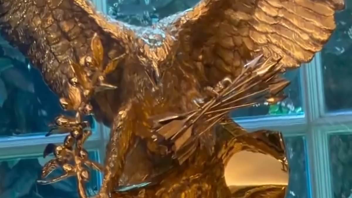 The focal point of this video was a majestic gold eagle statue, poised prominently in the room.