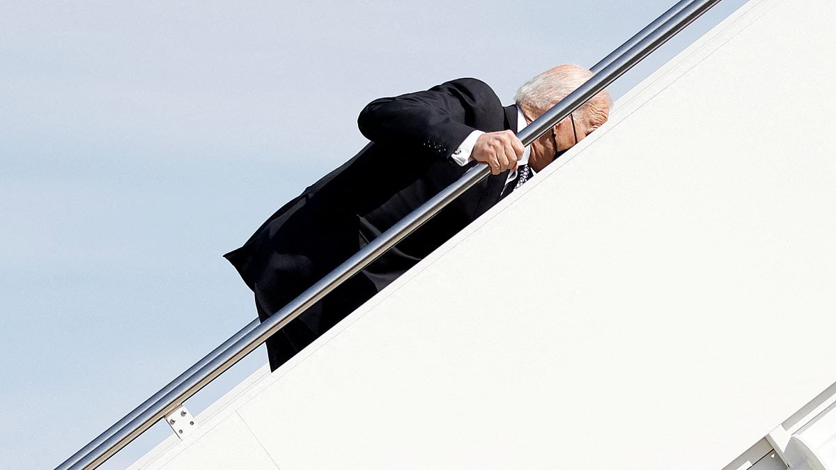 Former President Joe Biden is seen clinging to the railing of the staircase he used to board Air Force One on March 19, 2021 when he was traveling to Atlanta, Georgia. He tripped three times on the Air Force One stairs that day