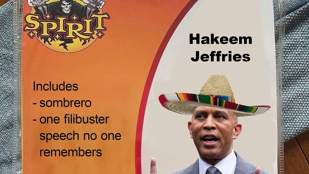 The mock costume for Jeffries humorously suggests he comes with a sombrero and a ‘filibuster speech no one remembers,’ while notably lacking in ‘common sense.’ This playful jab plays on stereotypes and political criticisms often leveled at the Democrats.