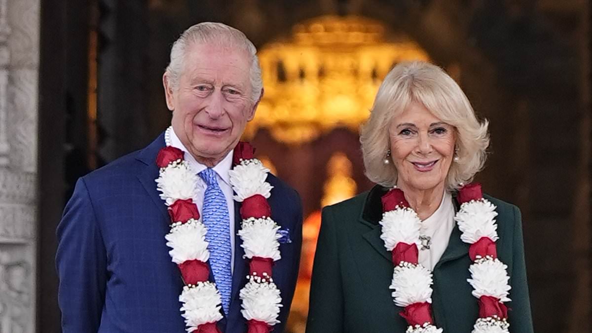 The King, 76, received a ceremonial welcome as he met members of a Hindu temple in Neasden, London on Wednesday alongside Queen Camilla, 78 (pictured together)