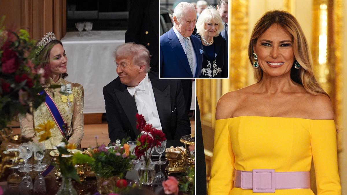 Britain’s King Charles and Queen Camilla stand with President Donald Trump and First Lady Melania Trump at the state banquet at Windsor Castle back in September 2025