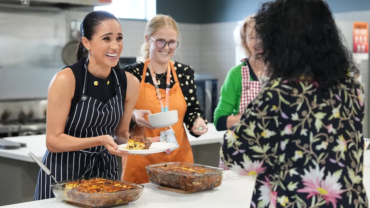 Meghan beams as she serves lunch at a women's homeless shelter after visiting a children's hospital with Harry on the first day of their whirlwind tour of Australia