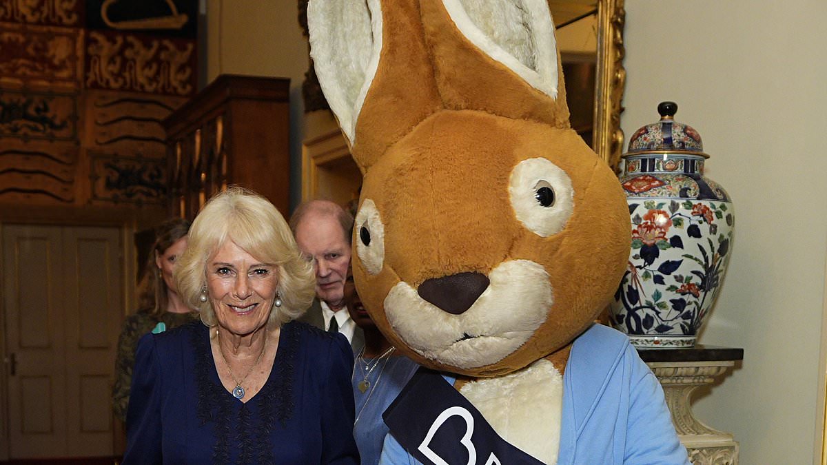 Queen Camilla welcomes Peter Rabbit and Richard Osman for 100th anniversary of children's literature charity at Clarence House