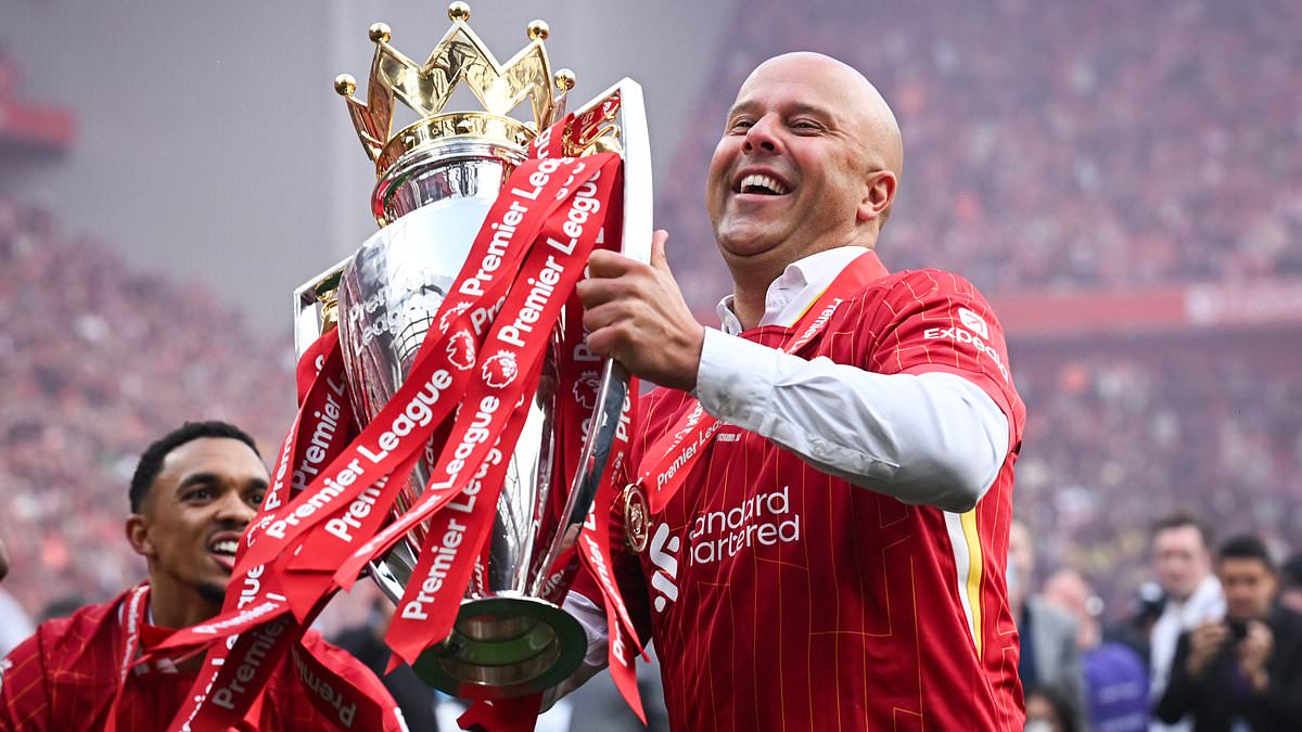 Slot celebrates with the Premier League title, won by 10 points in his first season at Anfield