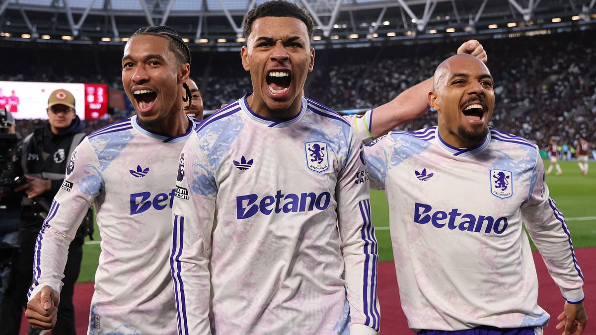 Boubacar Kamara (left), Rogers (centre) and Donyell Malen celebrate Villa’s victory at the London Stadium