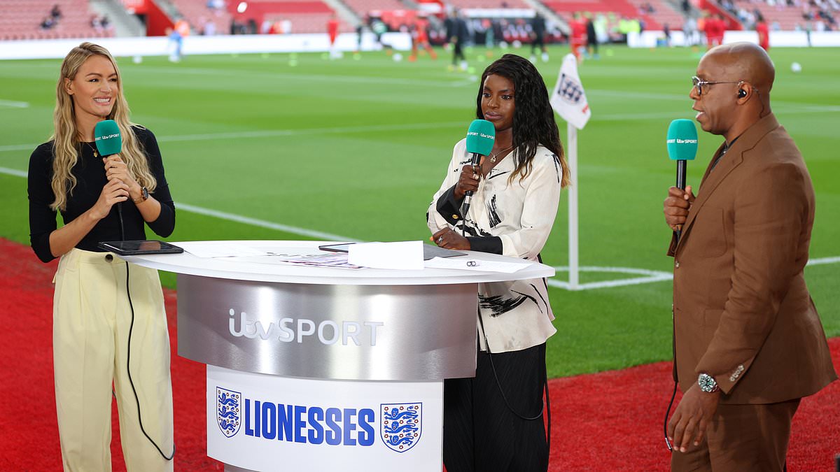 ‘Let’s go over to ITV, I’m in the stands with 105 caps, so you have got two women with 290 caps, something ridiculous right. Right ITV, it’s Ian Wright, Emma Hayes and Kaz Carney.