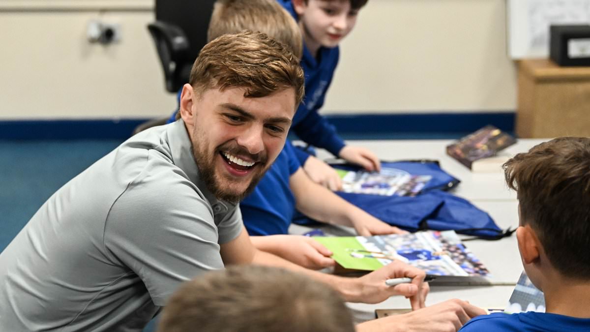 The kids are blindfolded and have to guess the identity of their ‘secret reader’ as Dewsbury-Hall makes his way slowly through a page of a Harry Potter book he has chosen. When his identity is revealed, there is classroom bedlam. An enthusiastic signing session follows, as Dewsbury-Hall makes his way from table to table talking about books, reading and a fair bit of football.